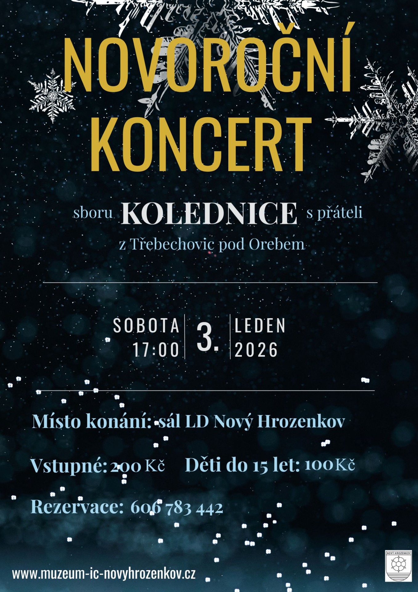 Kulturní centrum Nový Hrozenkov zve na Novoroční koncert sboru KOLEDNICE pod vedením novohrozenkovské rodačky Marie Dernerové. Zpěváci a hudebníci z Třebechovic pod Orebem vystoupí v sále Lidového domu v Novém Hrozenkově v sobotu 3. ledna 2026 v 17 hodin. Vstupné: 200 Kč, děti do 15 let: 100 Kč. Předprodej vstupenek už nyní v IC Nový Hrozenkov.