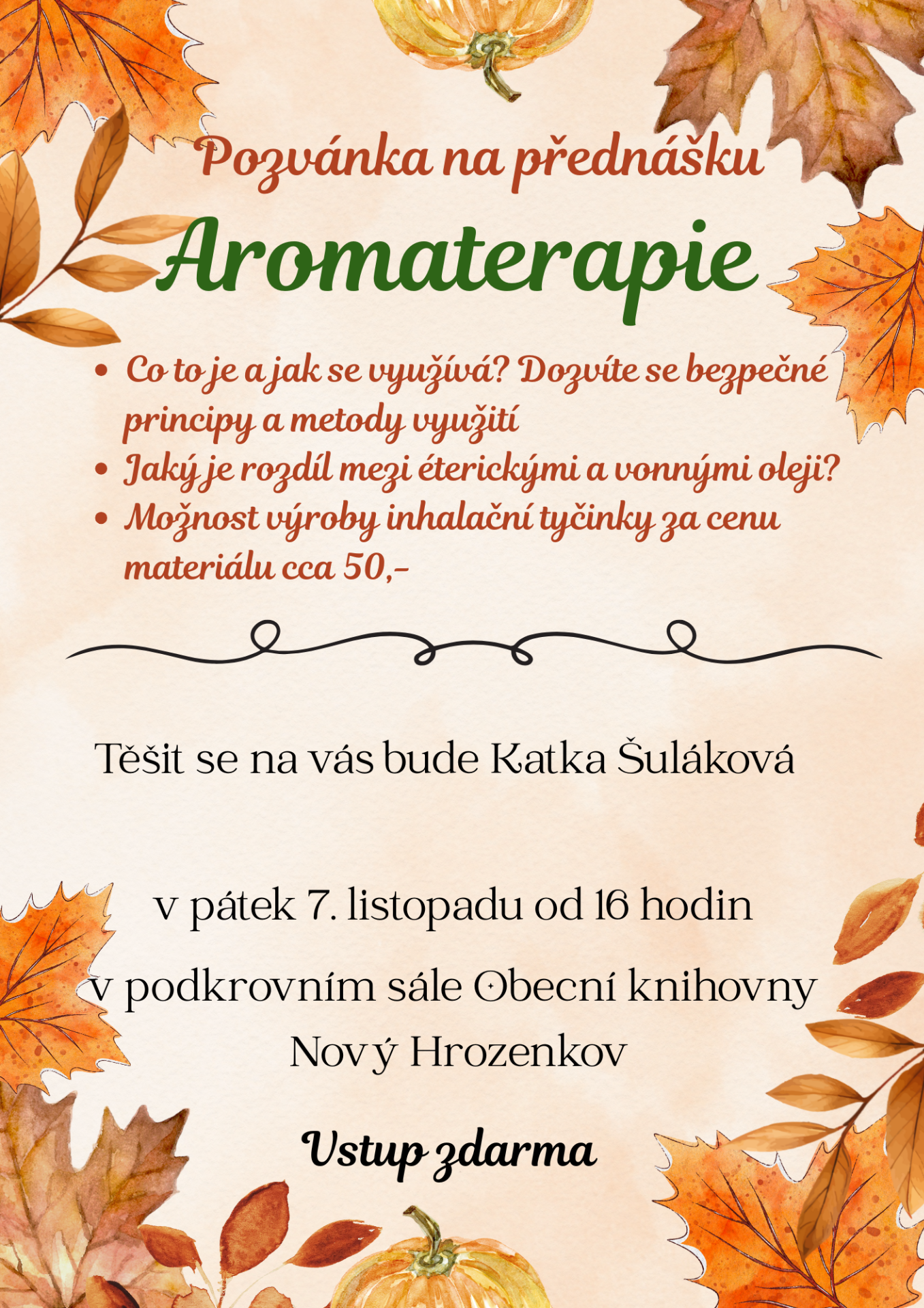 Obecní knihovna Nový Hrozenkov zve na přednášku Aromaterapie, která se uskuteční v pátek 7. listopadu 2025 od 16 hodin v podkrovním sále knihovny. Fascinujícím světem vůní vás provede Katka Šuláková. Vstup zdarma.