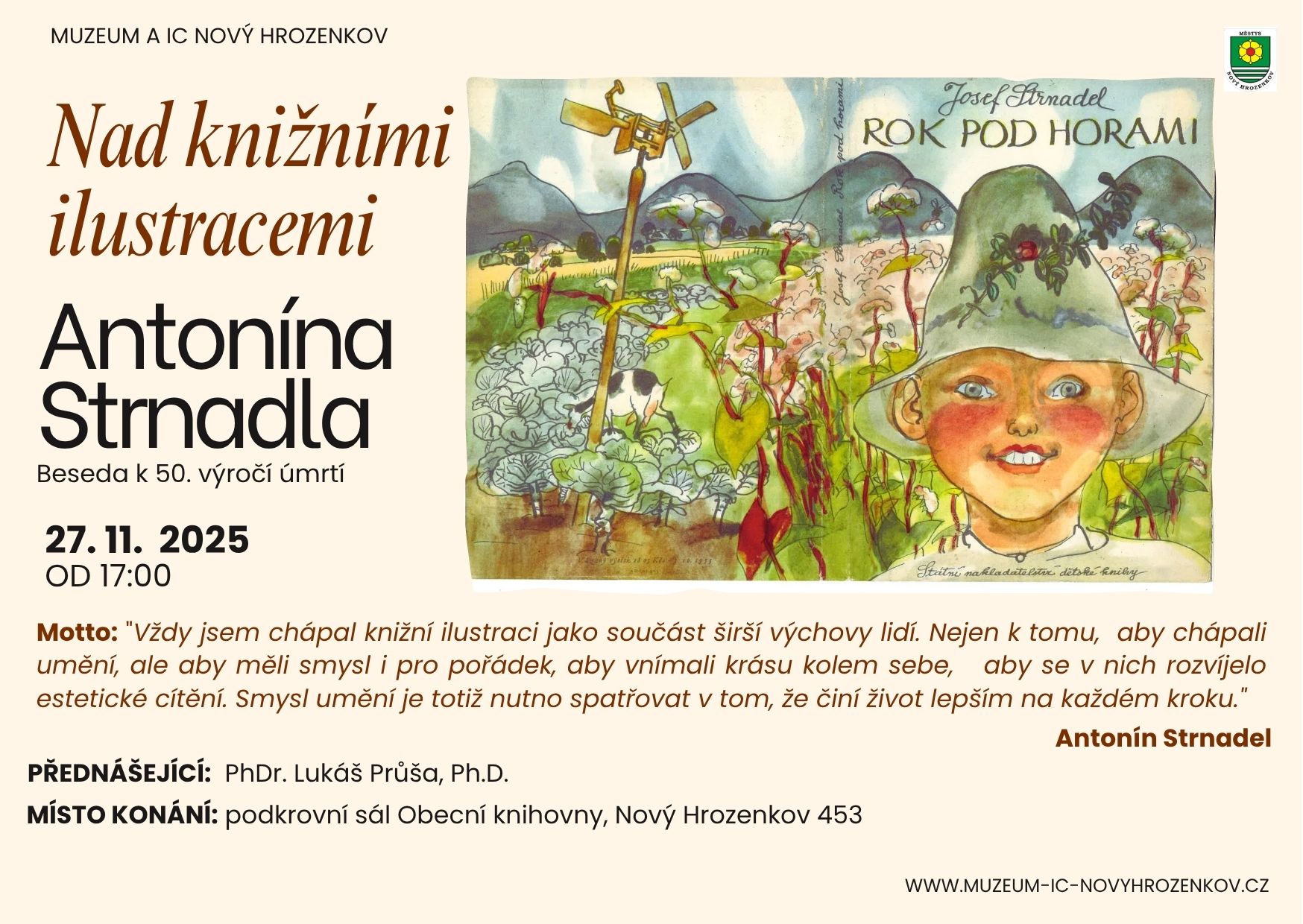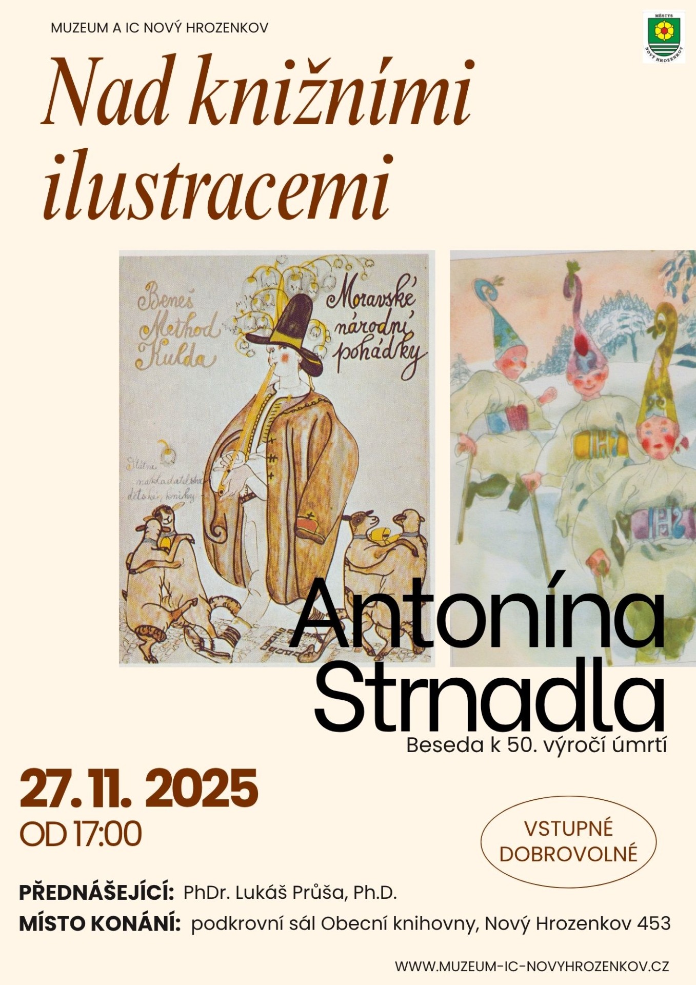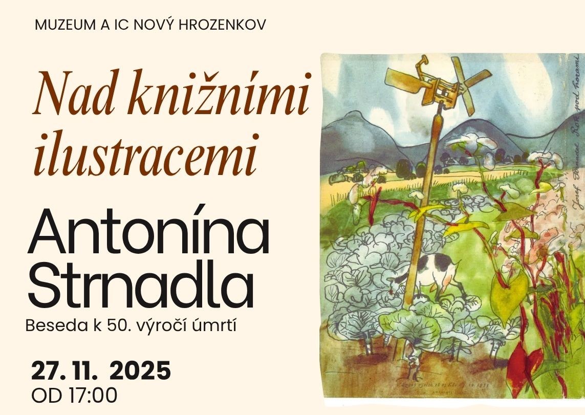 Muzeum a IC Nový Hrozenkov zvou na přednášku PhDr. Lukáše Průši Ph.D. nazvanou "Nad knižními ilustracemi Antonín Strnadla", která se uskuteční v podkrovním sále Obecní knihovny v Novém Hrozenkově ve čtvrtek 27. listopadu 2025 v 17 hodin. Vstupné dobrovolné.