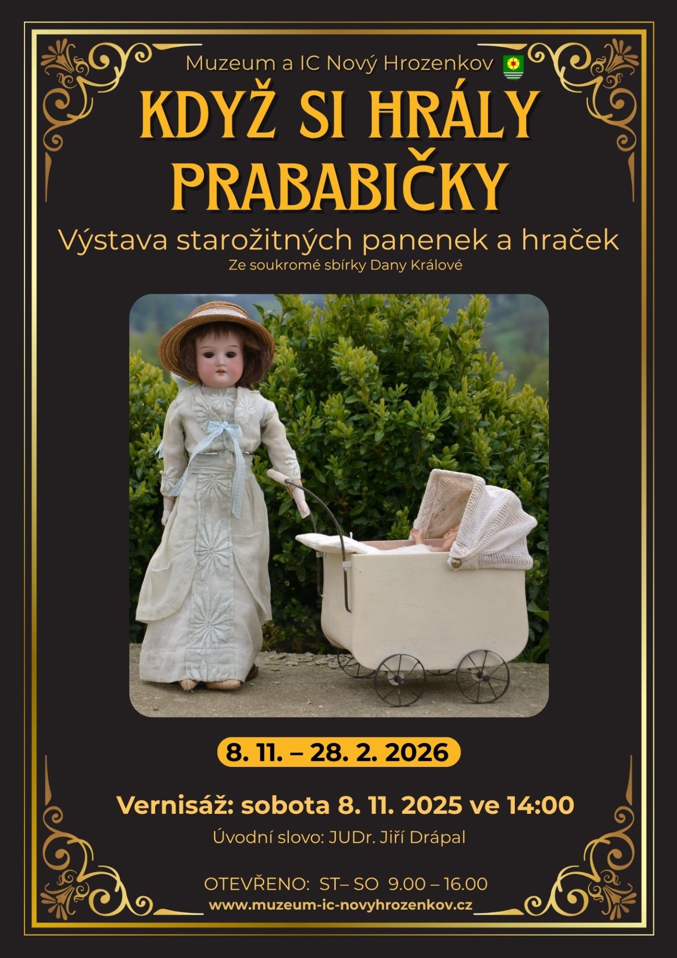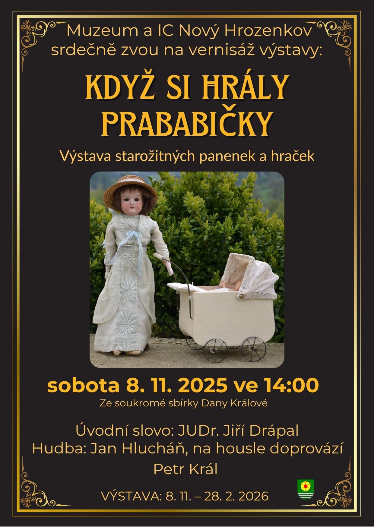 Další chystaná výstava začne v muzeu Nový Hrozenkov v budově Maštale v sobotu 8. 11. 2025 ve 14:00, kdy proběhne vernisáž výstavy Když si hrály prababičky. Na výstavě budou k vidění historické panenky a hračky ze soukromé sbírky Dany Králové.